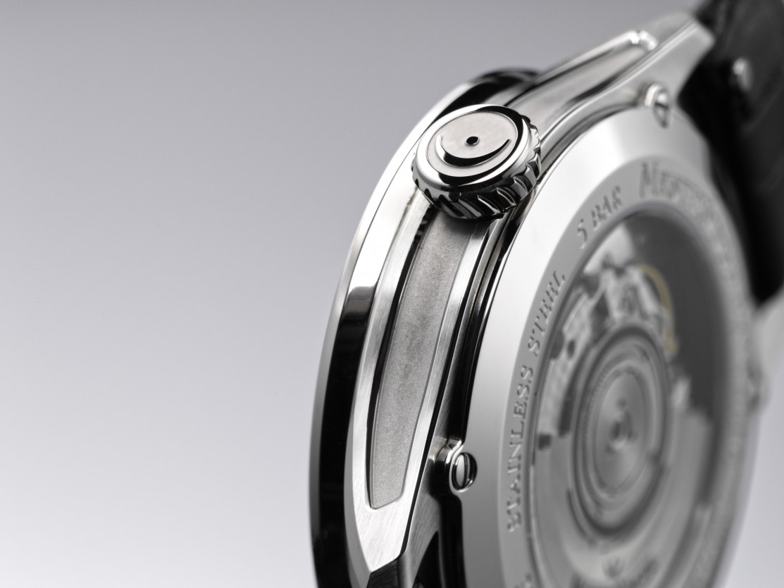 Точно над цифрата 6 се върти малко колело веднъж в секунда, т.нар. „слънчево колело“. Това е дискретен начин да се потвърди, че часовникът работи, въпреки че не измерва секундите по класическия начин. Корпусът е с диаметър 40,5 мм и дебелина около 11,25-12,3 мм, водоустойчивост 5 бара (50 м). Сапфирено стъкло с AR покритие отпред, прозрачен заден капак (вижда се перленият модул и антрацитният ротор с три фермати). Коронката е спираловидна, смесени покрития: матирани, полирани, пясъкоструйни.
